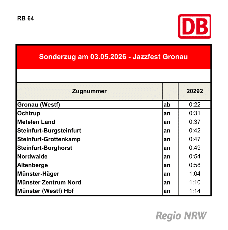 Besucher aus den Städten und Gemeinden entlang der Bahnlinie Münster – Gronau können aufgrund eines zusätzlichen Angebotes der Deutschen Bahn mit einem Sonderzug um 0:22 Uhr Uhr die Heimreise antreten.